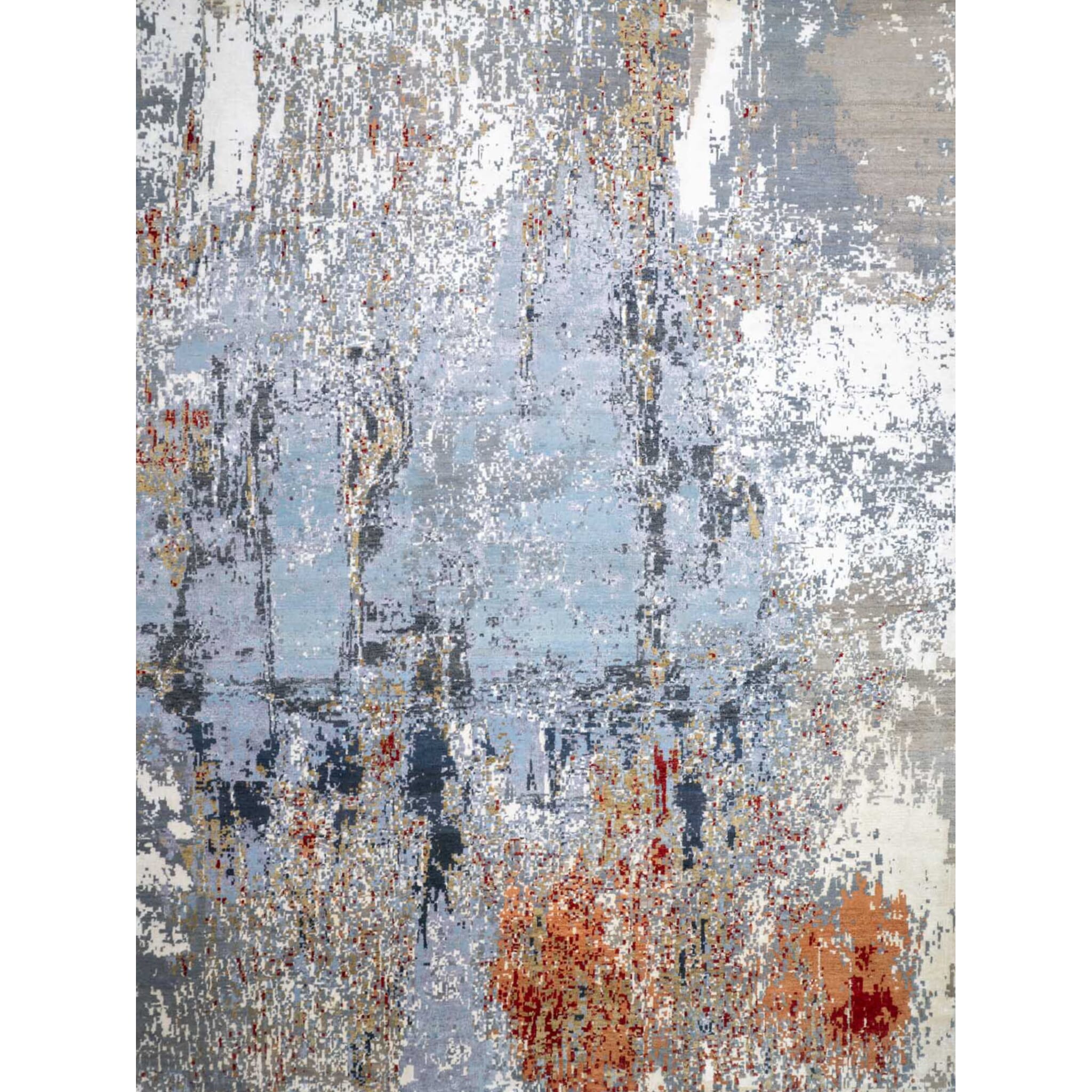 Polarity is a bold yet refined expression of contrast—where cool tranquility and quiet intensity meet in perfect balance. A layered abstract field of icy blues, misted greys, and soft ivory tones is punctuated by warm ember and copper accents, creating the visual sensation of fire meeting frost. Vertical textures cascade through the composition like reflections on water or distant city lights after rain, giving the rug depth, motion, and a gallery-like presence without overwhelming the space.